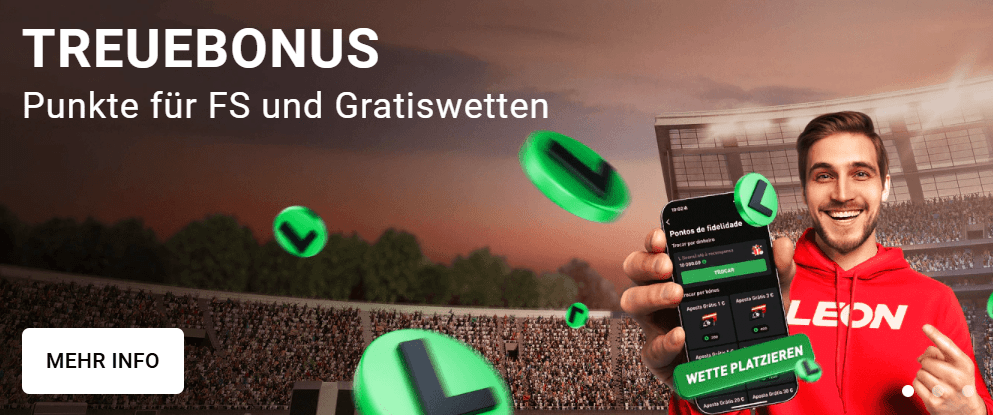 Auf der Suche nach einer beliebten und ansprechenden Sportwetten-Plattform bietet Leon.bet Deutschland großartige Promotionen für deutsche Nutzer an. Das Wettgeschäft ist in Deutschland so ausschlaggebend, und Leon.bet wollte diese Chance nicht versäumen. Schon bei der Anmeldung verdienen Sie dank Leon.bet Gratisspiele, und auch die weitere aktive Nutzung wird belohnt. Leon.bet Deutschland ist daher schon so gefragt! Das Treueprogramm bietet Anreize, um Anbieter weiterhin nutzen und auch frühere Kunden zurückgewinnen. Zu den Bonusfunktionen des Programms gehören zusätzliche Punkte sowohl für Ihre Verluste als auch für Ihre Gewinne.